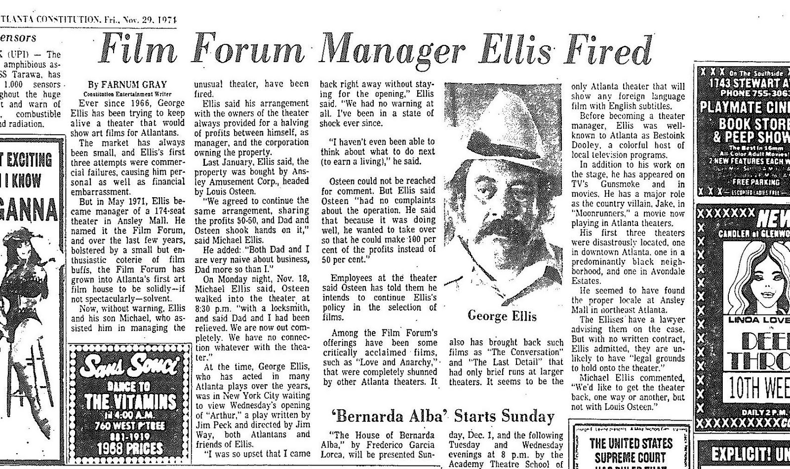 George Ellis (“Bestoink Dooley”) was also a stage figure in Atlanta and a TV figure. I think he appeared on TV as Bestoink. I saw him in a Jim Peck play called “Sterioptican,” which had in it one of my favorite lines ever: “Let’s make the humdrum optional.” My first memory of Ellis was when he opened what I believe was his first movie theater, a very small place in back of the downtown YMCA on Spring Street. From there he moved to Ansley Mall, et cetera. I went to his first movie theater on opening night. He offered us a refund (which we refused) because the theater had just that afternoon been treated with fire retardant and the smell of ammonia was almost overwhelming. But we toughed it out. The film was a black and white sub-titled movie about the Spanish Civil War. It was terrific. And he served coffee with whipped cream in the lobby.